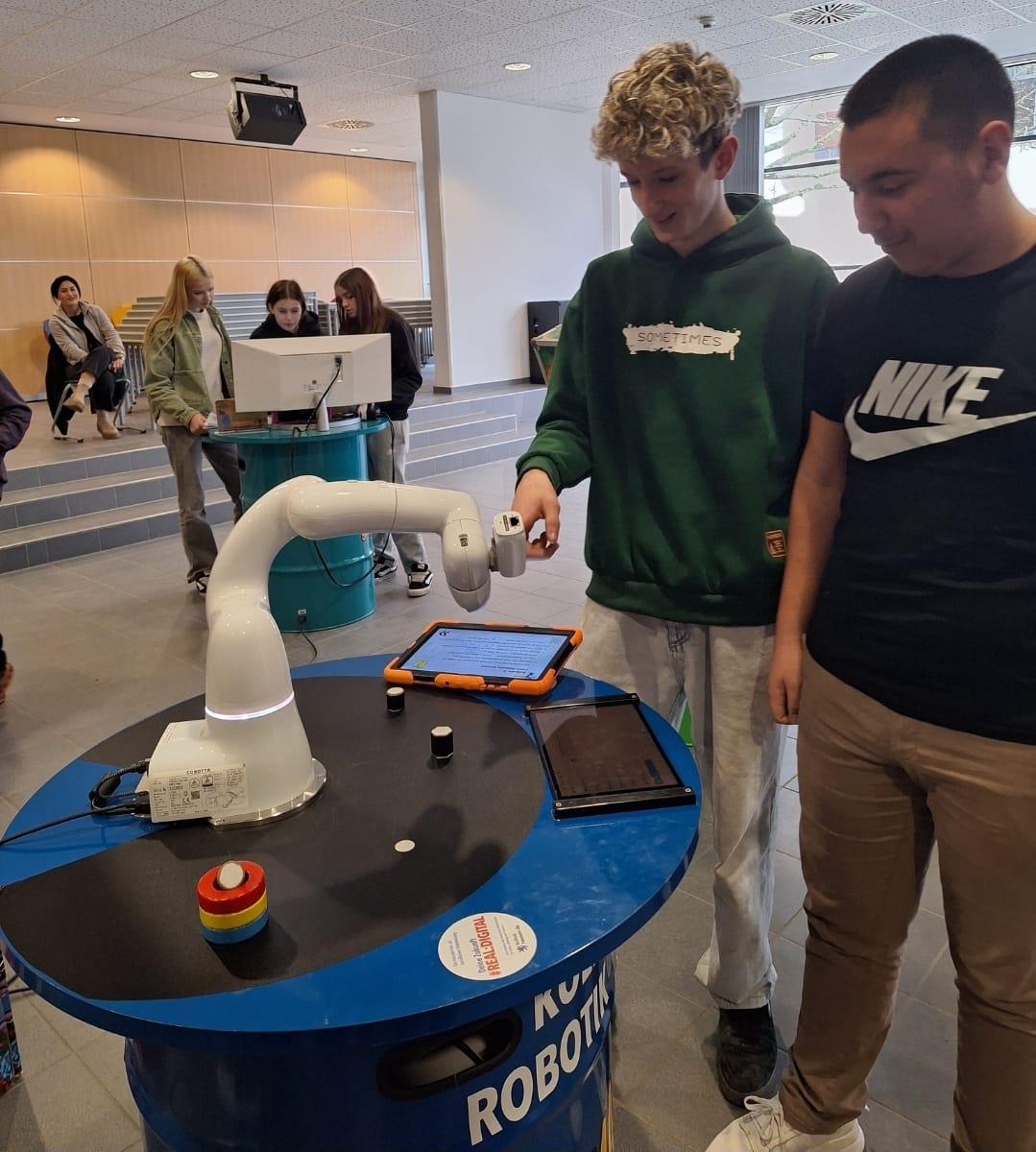 Bevor es ans Ausprobieren ging, kamen die beiden Coaches, die den Workshop leiteten, mit den Klassen ins Gespräch und führten sie in die diversen Begrifflichkeiten ein: Kollaborative Robotik, Big-Data-Analysen, Künstliche Intelligenz, Augmented Reality, Internet of Things und Sensorik wurden nicht nur erklärt, sondern auch ihre Auswirkungen auf die Arbeitswelt diskutiert.