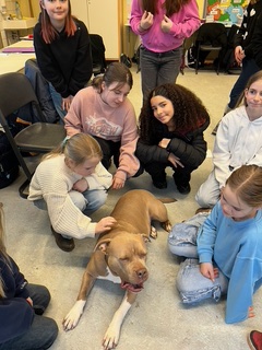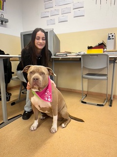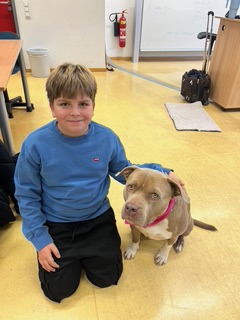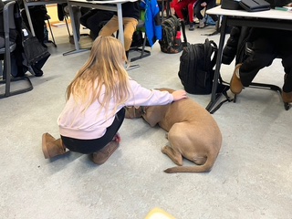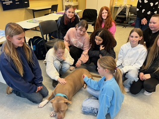 Mia ist ein ausgebildeter und geprüfter Schulhund, der gemeinsam mit ihrer Hundeführerin und Lehrerin an unserer Schule, Frau Susanne Marks, regelmäßig im Unterricht und Schulalltag aktiv ist.